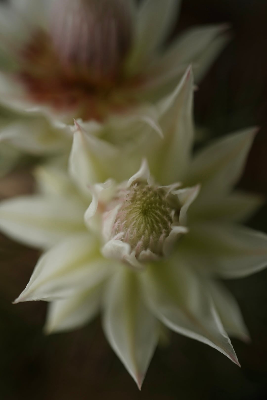 開花すると柔らかいピンク色の頭状花序が顔を出し、苞もほんのりとピンクがかります。
